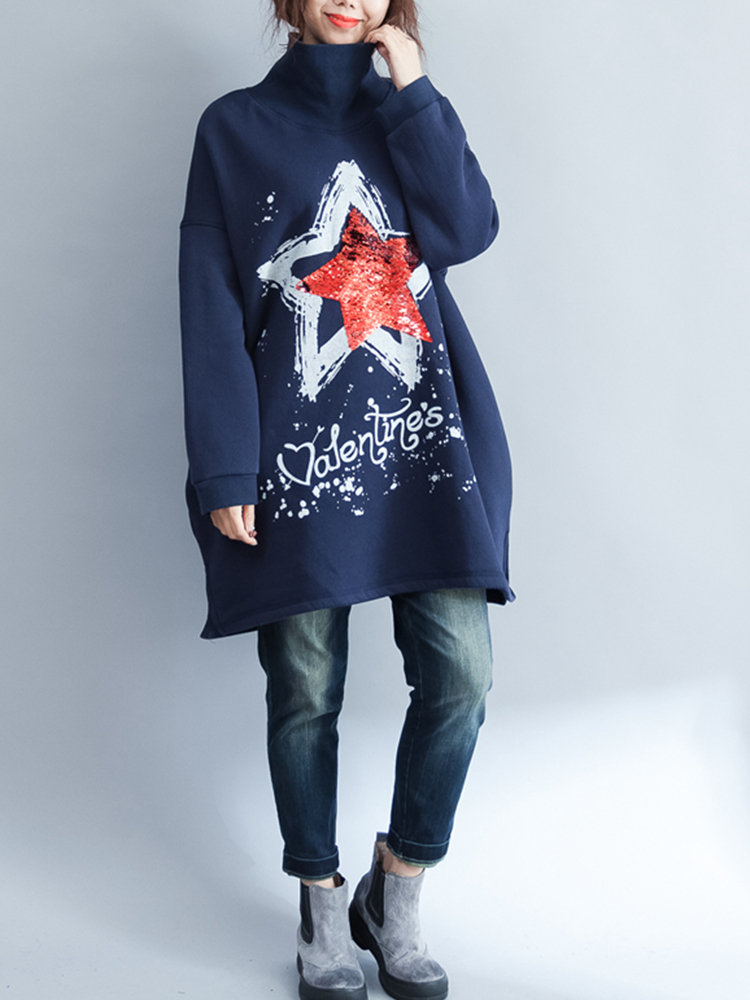 Sequins Star Letter Print High Neck Loose Casual Sweatshirts