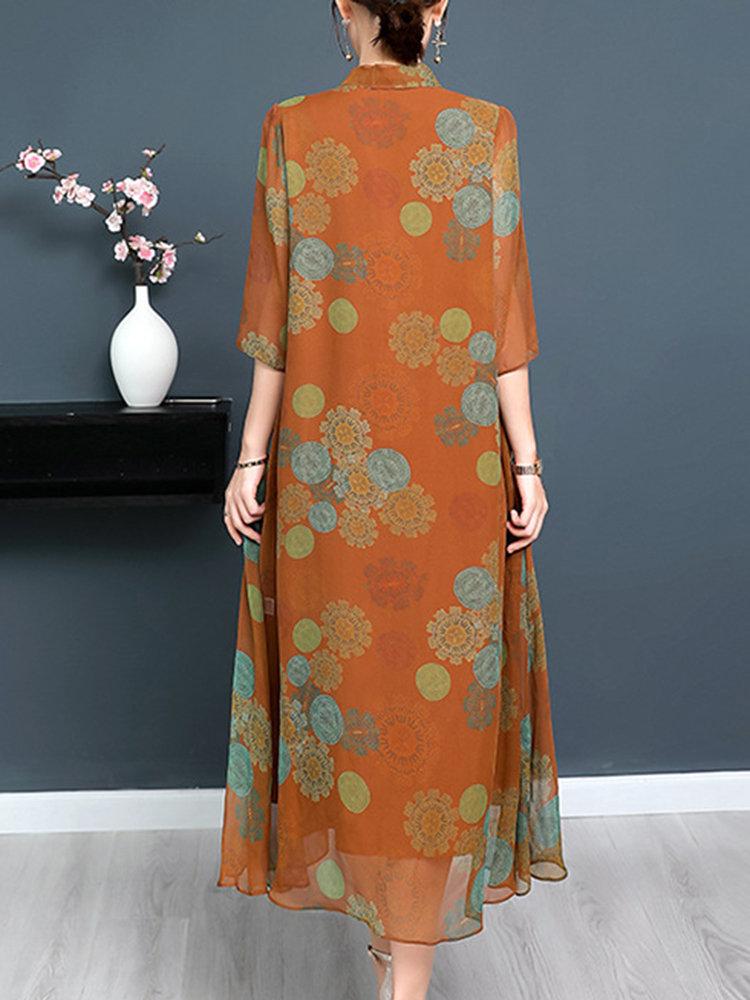 Vintage Printed Batwing Sleeve Irregular Hem Layered V-Neck Dresses